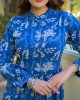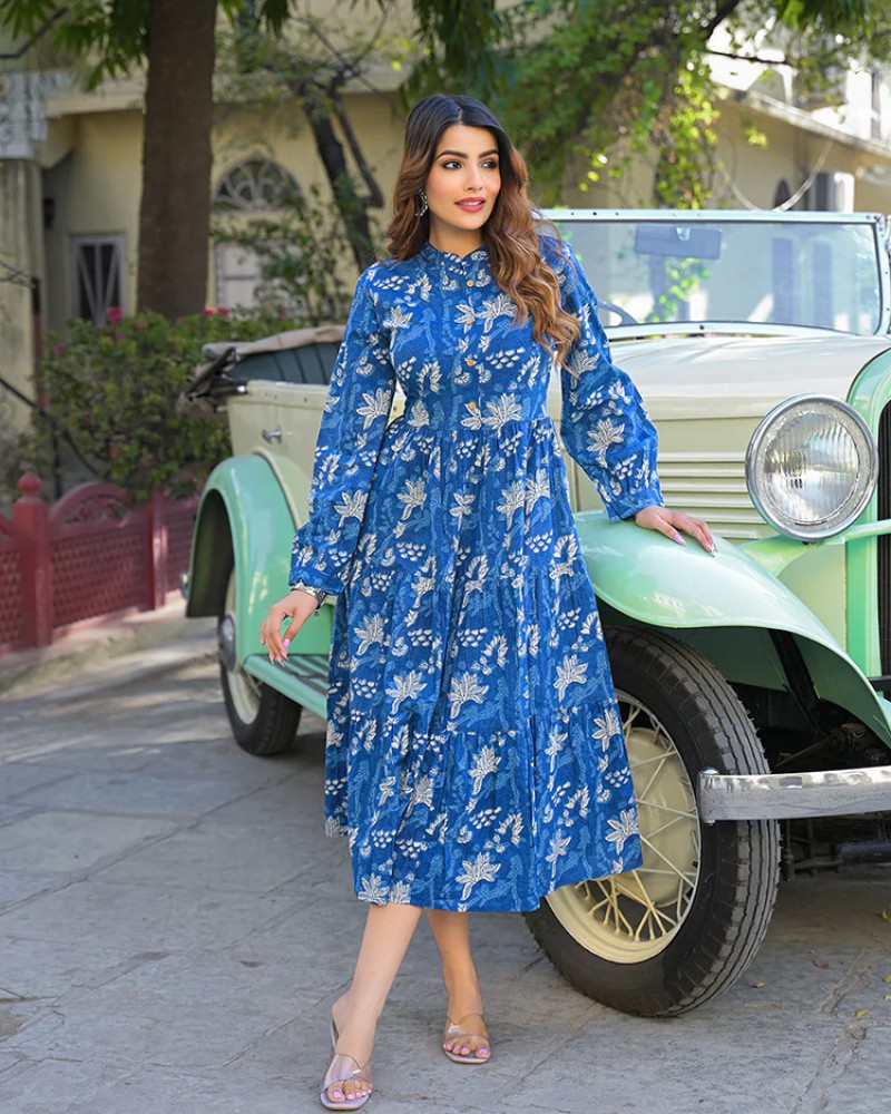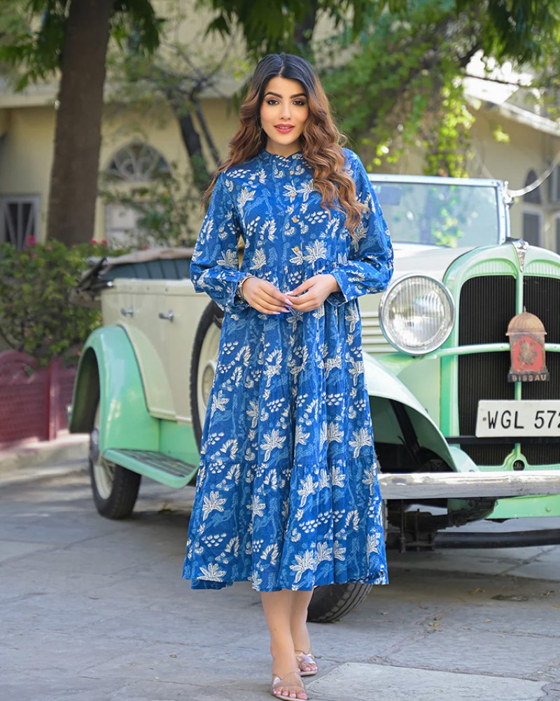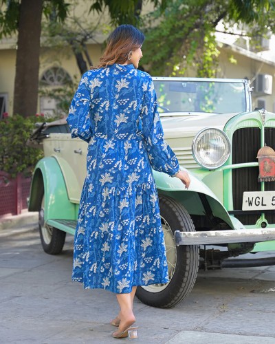 Divena Blue Floral Print Cotton Fabric Flared Dress