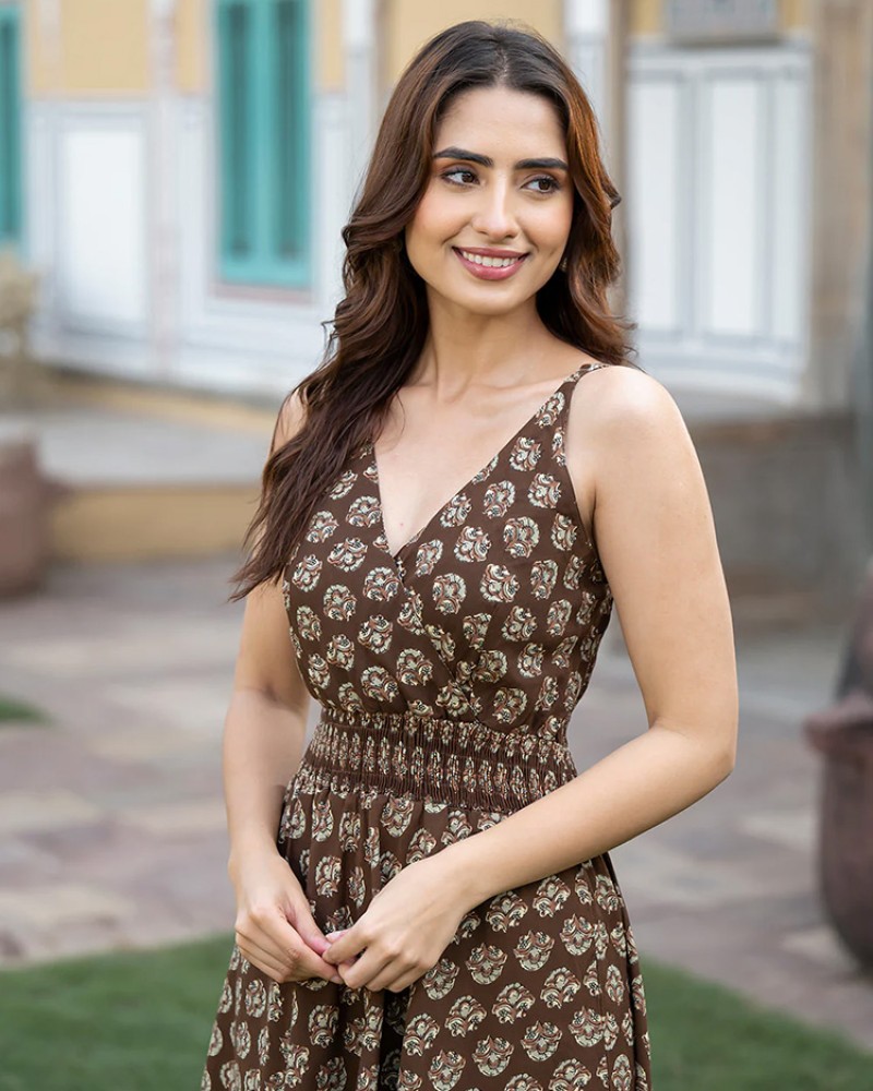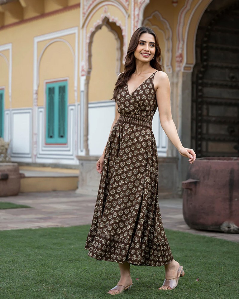 This Divena Brown Floral Print Pure Cotton Fit & Flare Dress The fit and flare style is flattering, accentuating the waist while allowing for a flowy skirt that moves beautifully. this floral print adds a fresh, cheerful vibe, perfect for spring or summer outings.