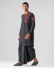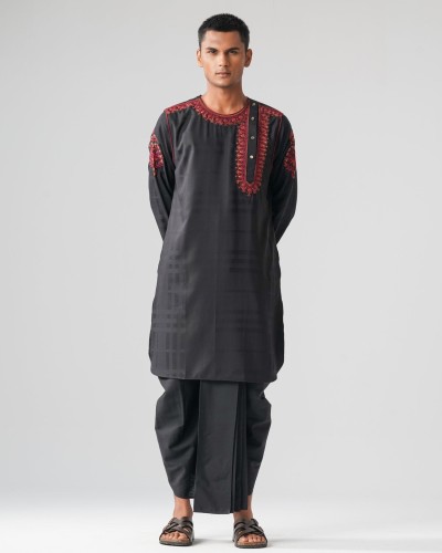 Stylish black mens panjabi crafted from soft mixed cotton fabric for comfort and durability. Features a round neck with mid shoulder-down placket and intricate embroidery, adding a modern traditional touch. Perfect for festive occasions, cultural events, or casual ethnic wear.
