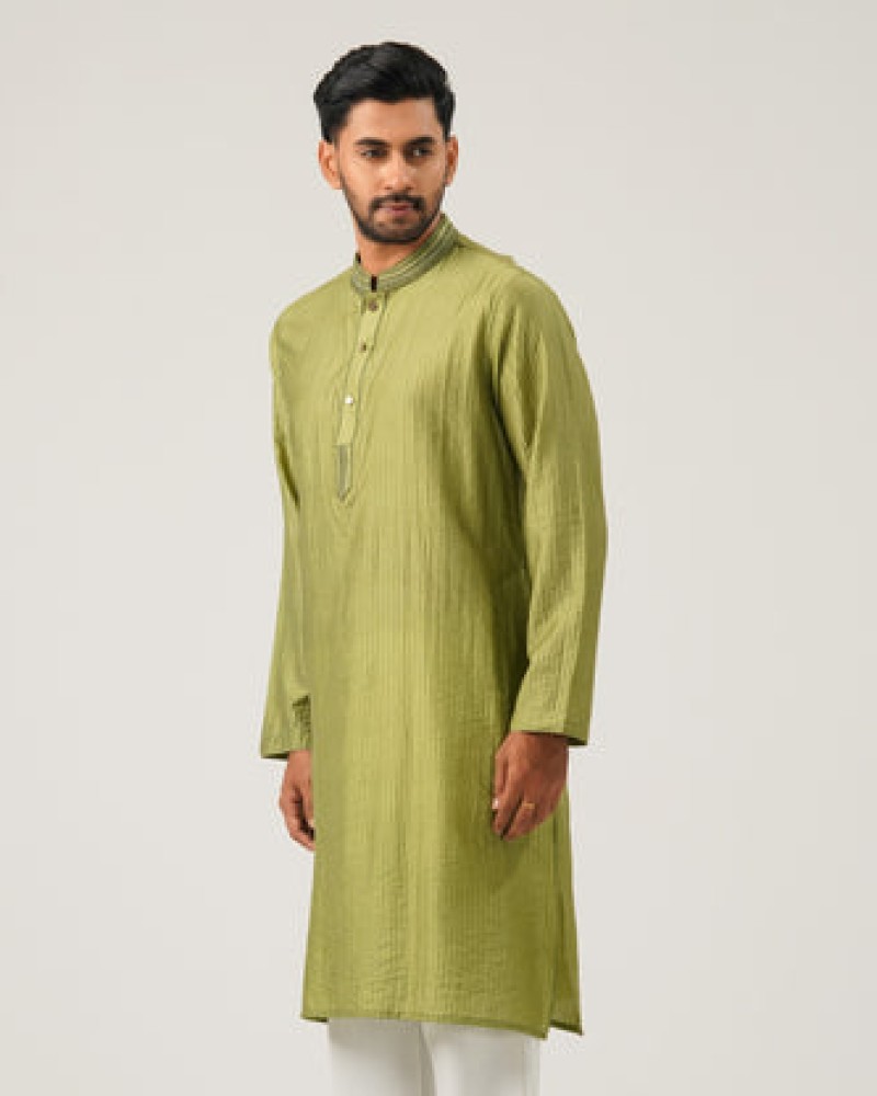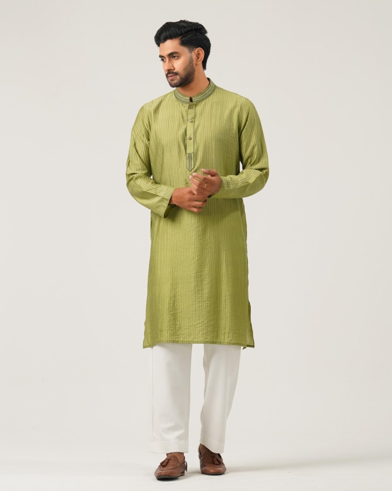 This embroidery mens Panjabi, crafted from blended fabric in olive green, features subtle embroidery for a refined touch. Its slim-fit silhouette offers a modern and flattering look, ideal for both festive occasions and elegant gatherings.