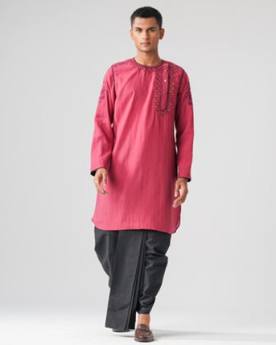 Stylish maroon mens panjabi crafted from soft mixed cotton fabric for comfort and durability. Features a round neck with mid shoulder-down placket and intricate embroidery, adding a modern traditional touch. Perfect for festive occasions, cultural events, or casual ethnic wear.